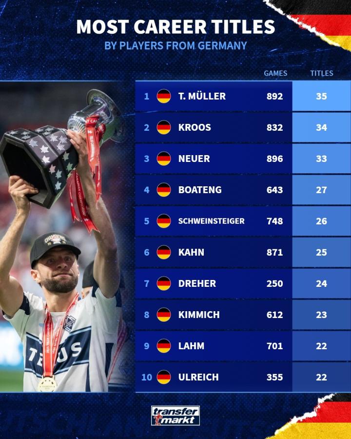 在随温哥华白浪队夺得加拿大冠军联盟桂冠后,托马斯-穆勒的职业生涯冠军总数已达35座,这一成就使他超越托尼-克罗斯,成为德国球员中夺冠次数最多者。